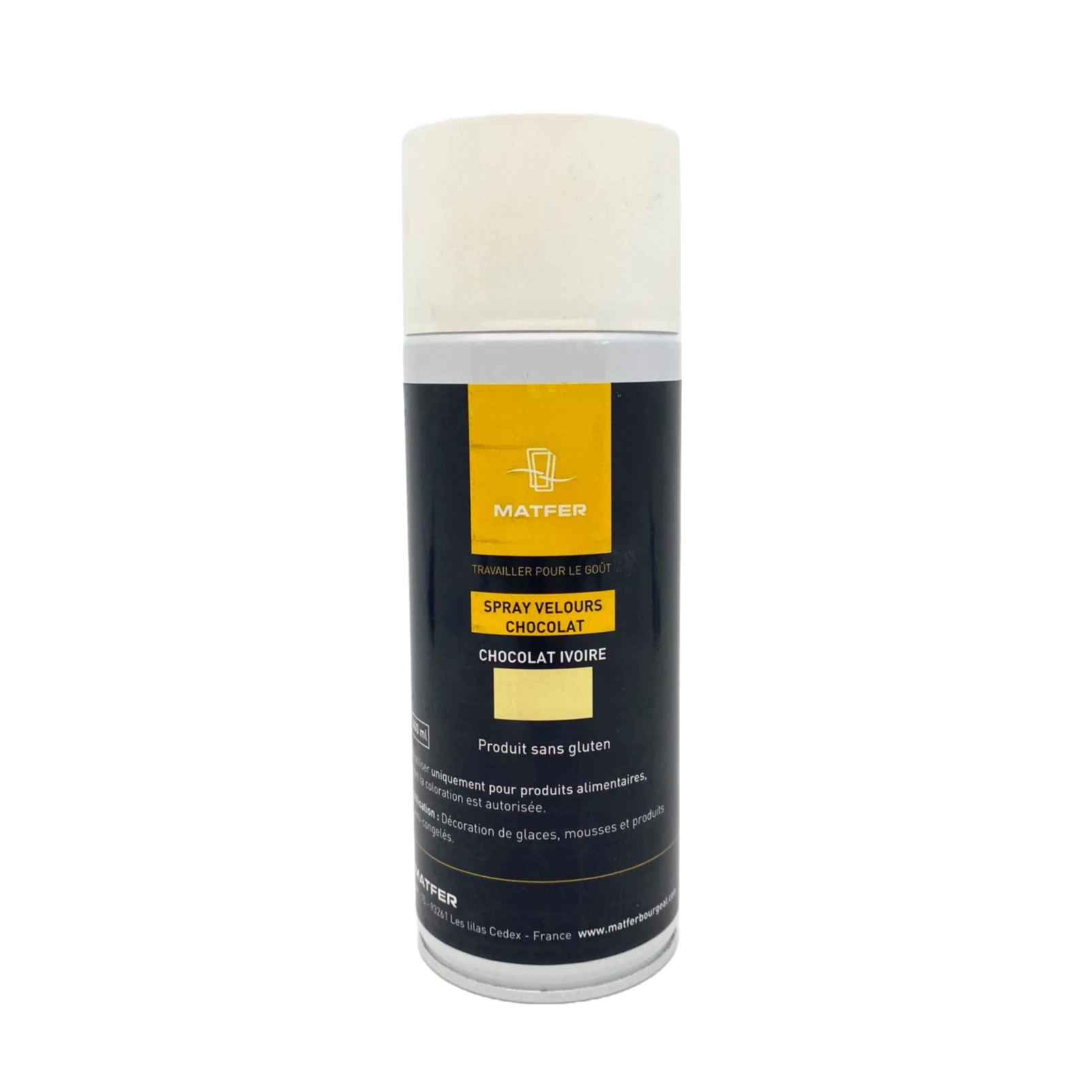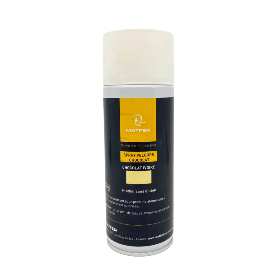 White chocolate food colouring spray for a velvety effect when decorating desserts.