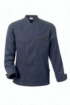 Long-sleeved denim chef's jacket with snap buttons, collar, and chest pocket.