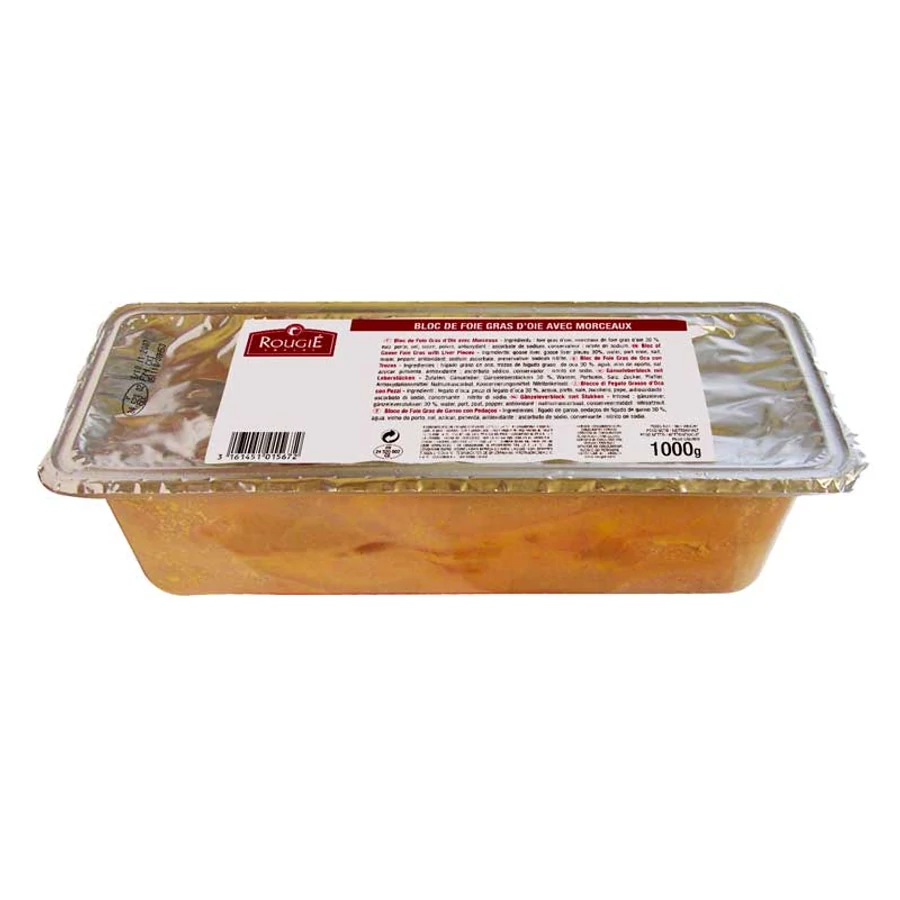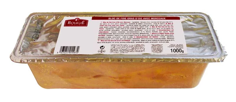 Delicately seasoned duck liver, min. 30% diced liver pieces. It has a nice, rustic cut surface.
