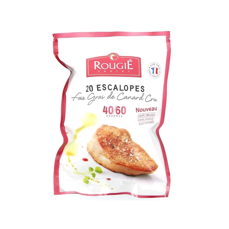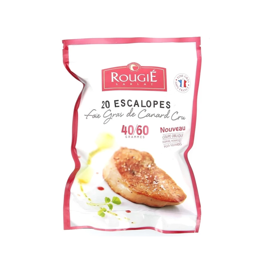 Slices of duck liver of equal size (40/60g), fattened. Minimal fat melting.