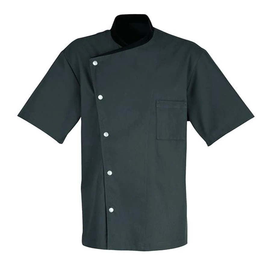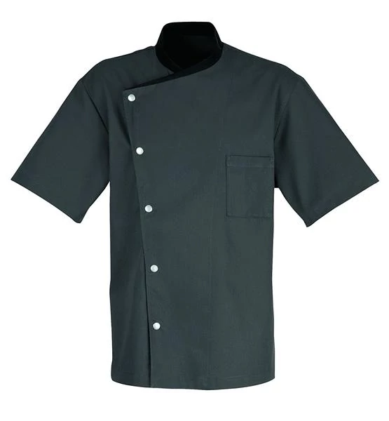Short-sleeved men's chef jacket with snap buttons. With breast pocket and underarm vents.