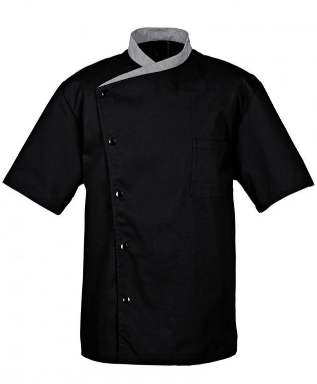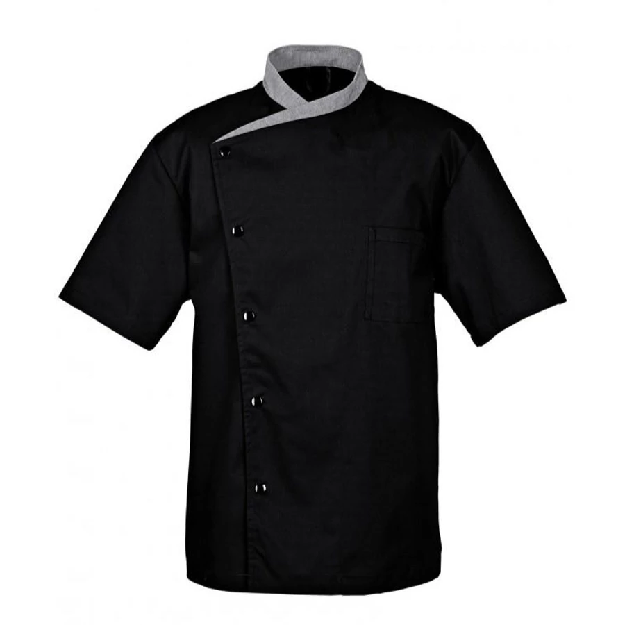 Short-sleeved men's chef jacket with snap buttons. With breast pocket and underarm vents.