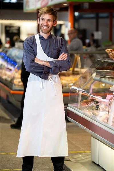 Butcher's apron with shoulder straps. Reinforced waist straps on the sides.