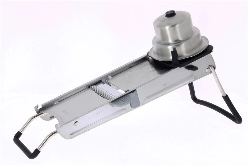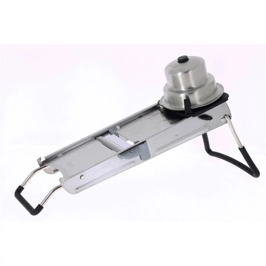 Stainless steel mandolin with double and ribbed blade, textured surface.