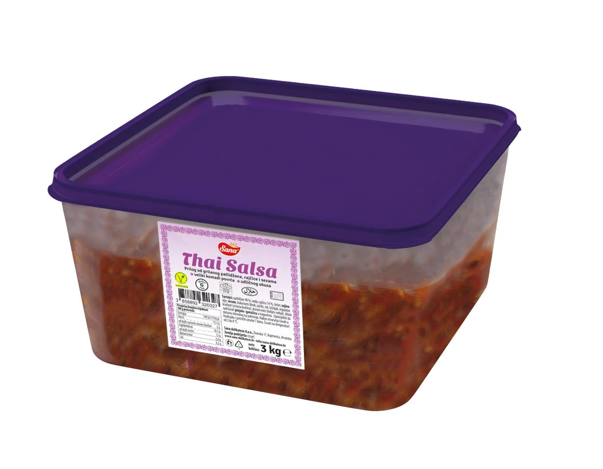 Thai salsa can be served cold or warm, with pasta, rice, or salad. Since it is packaged in a polypropylene container, it can also be heated in the microwave.