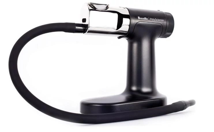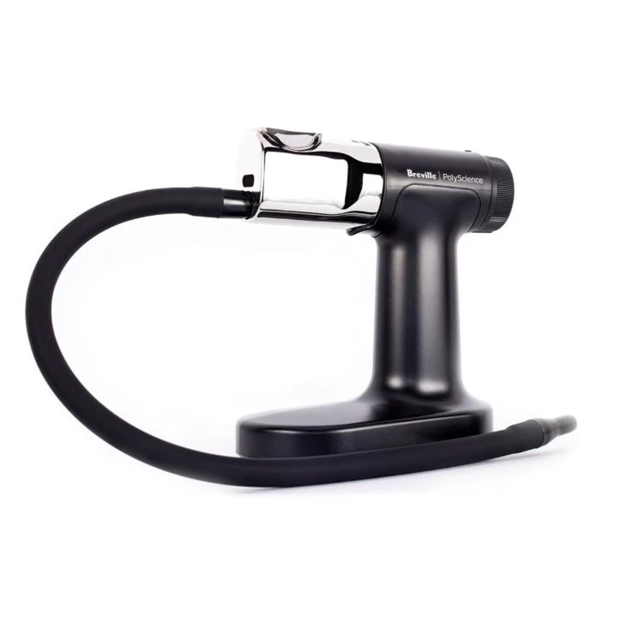 A hand-held smoke gun for adding a smoky flavour to food before and after heating, or even cold.