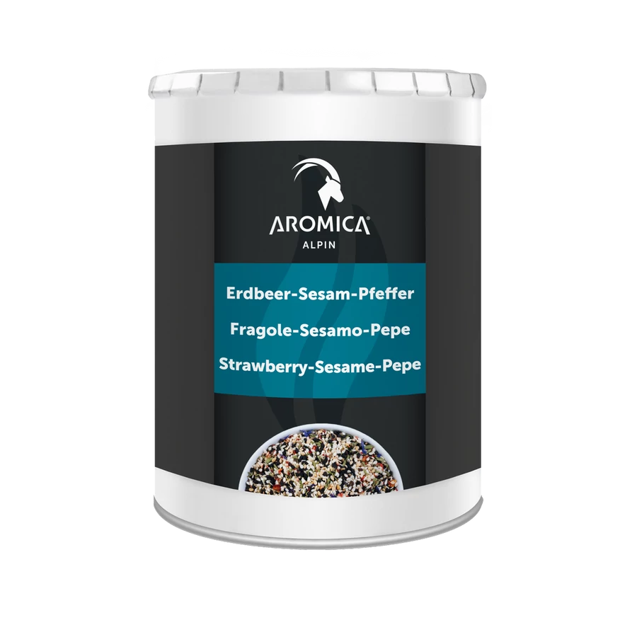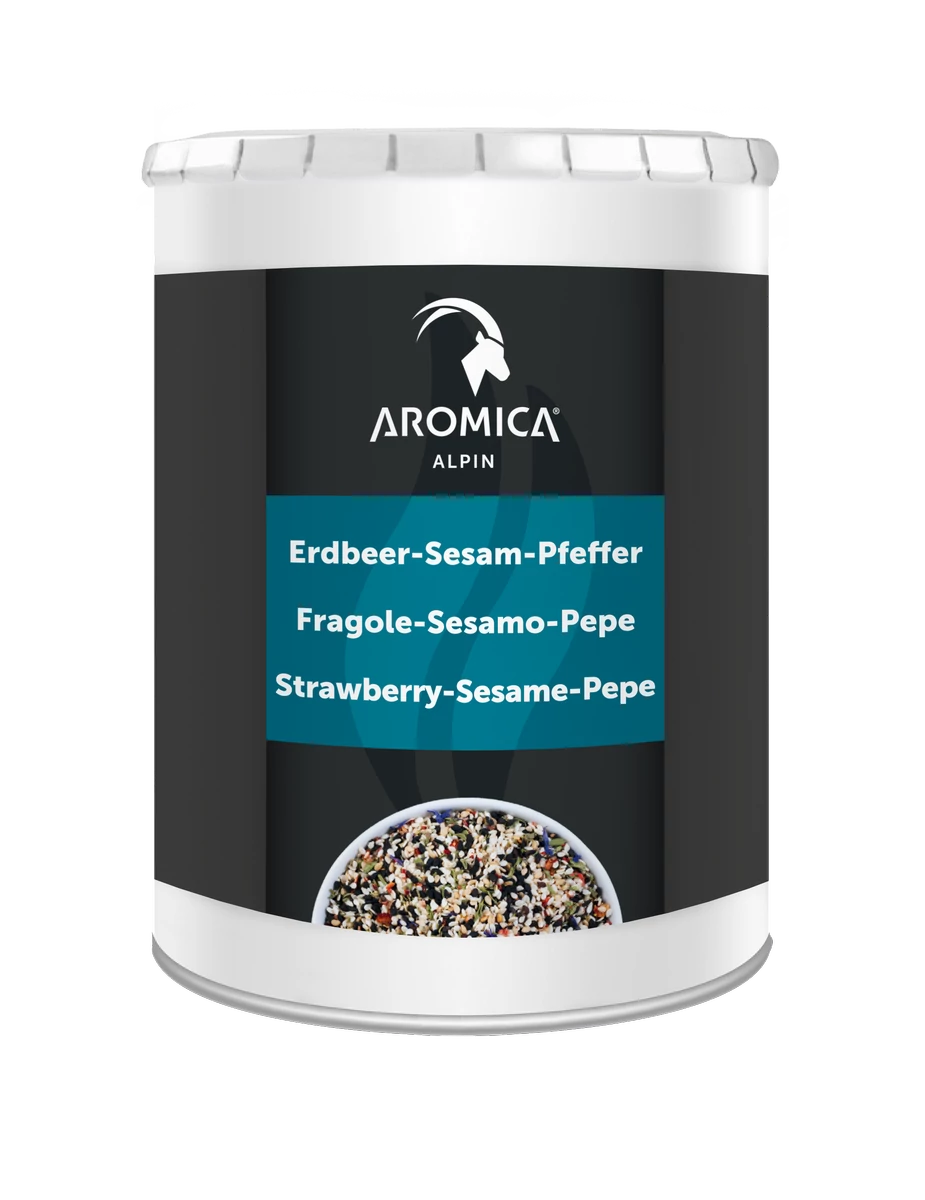 Ingredients: white sesame seeds 57%, black sesame seeds 27%, strawberries 9,5%, pepper 3,5%, fennel, thyme, cornflower petals.