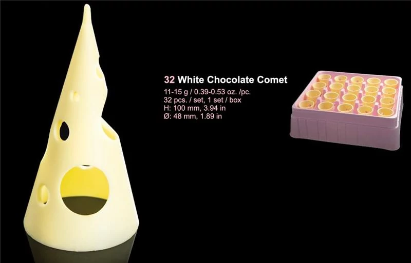 Pointed cone-shaped decoration with holes made of white chocolate.